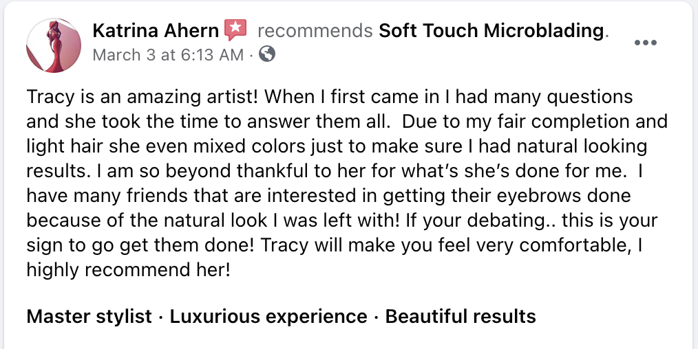 Microblading & permanent make up is rewarding to me because it allows me to make an impact on my clients' lives and I take pride in my work.